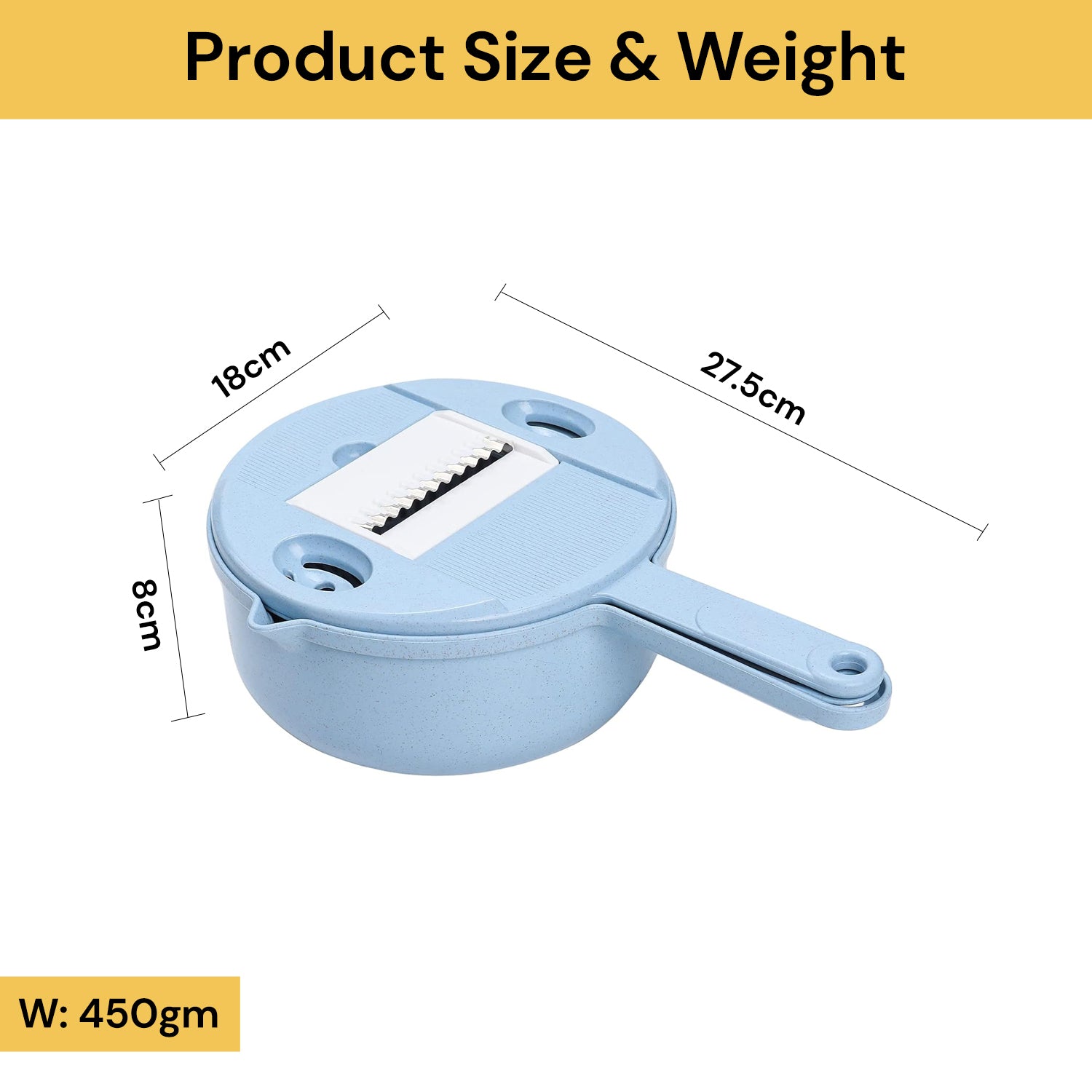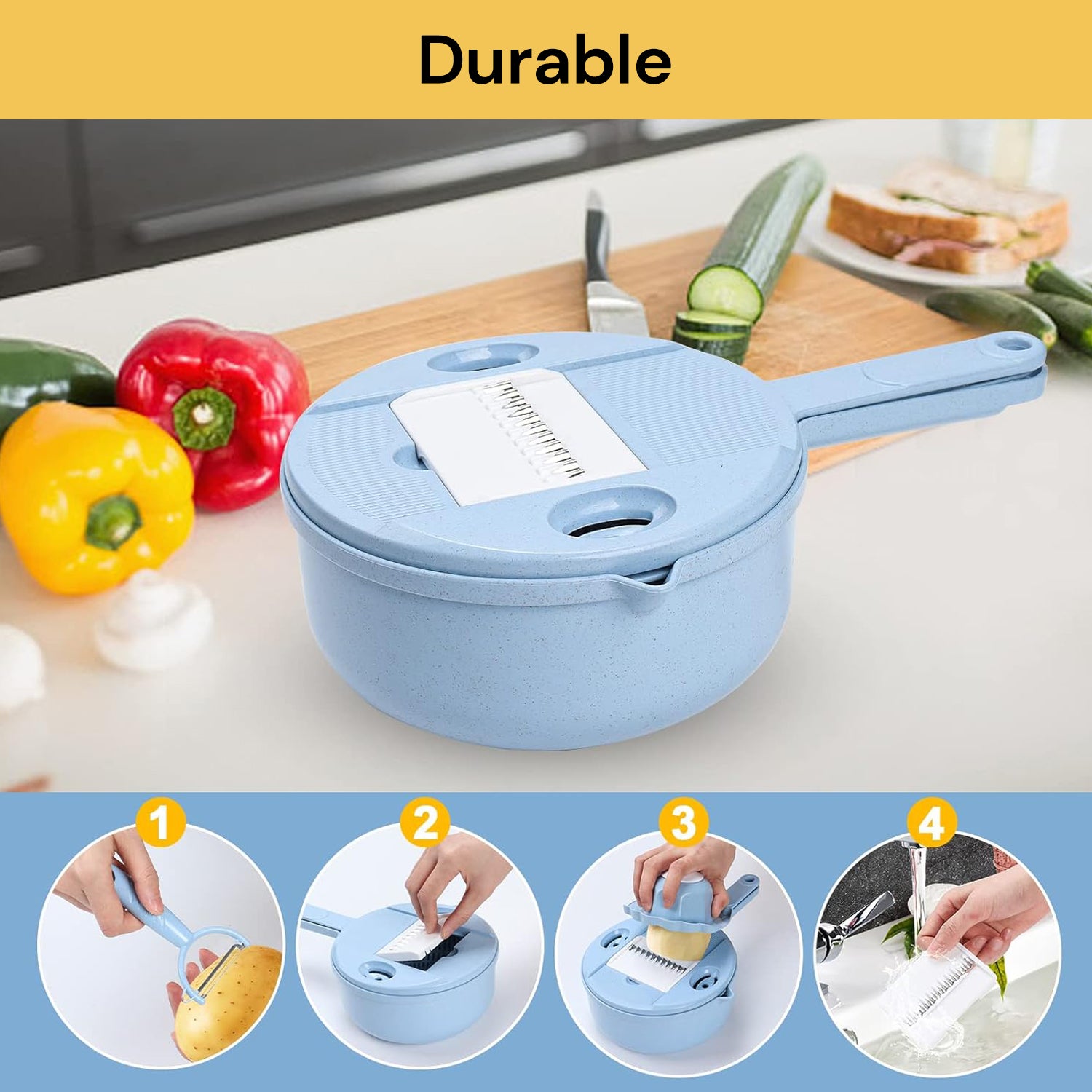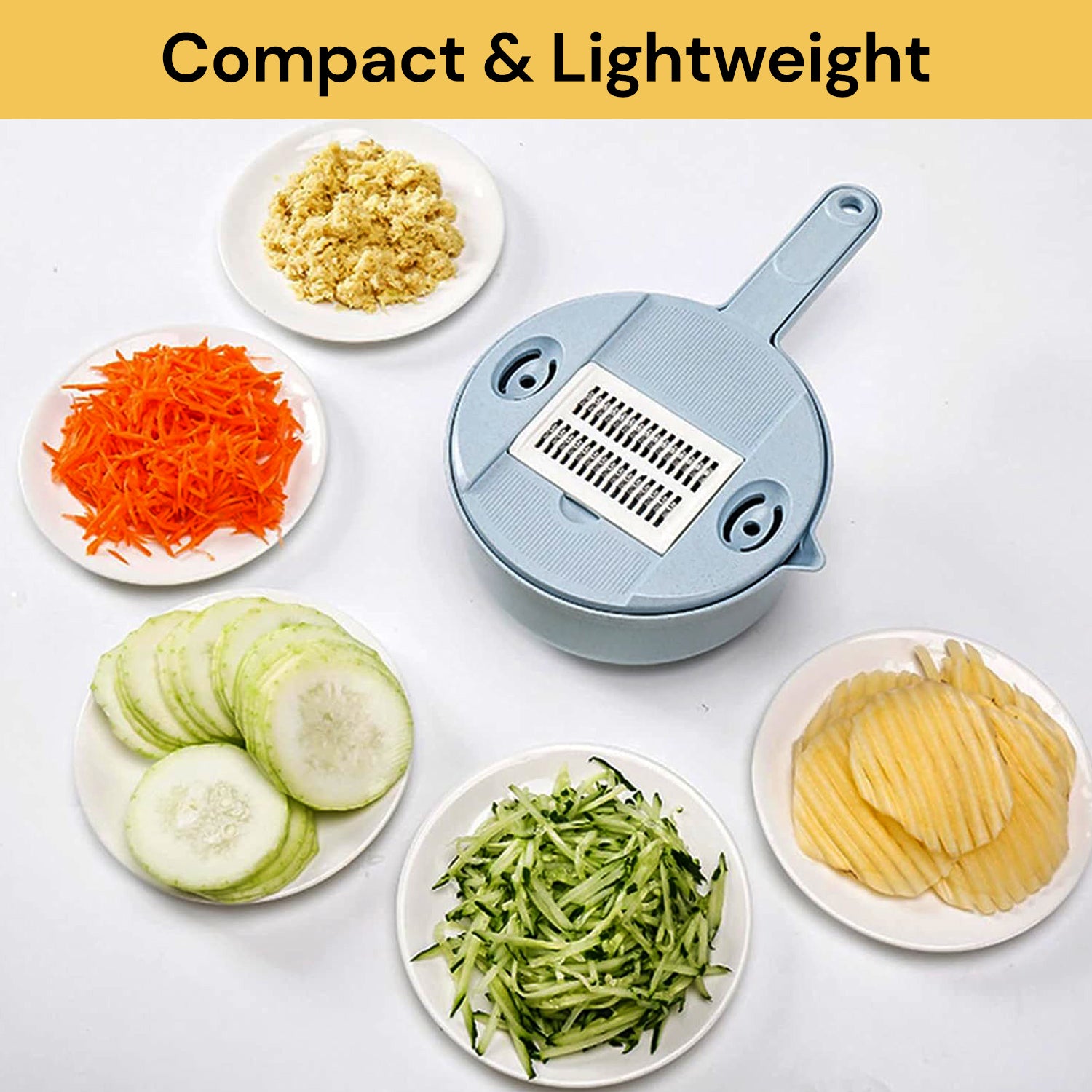 12 In 1 Vegetable Slicer: You will get a Multi-Function Vegetable Slicer with 5 Interchangeable Blades, Food Container, Drain Basket, Peeler, Egg Divider and Protective Handholder.