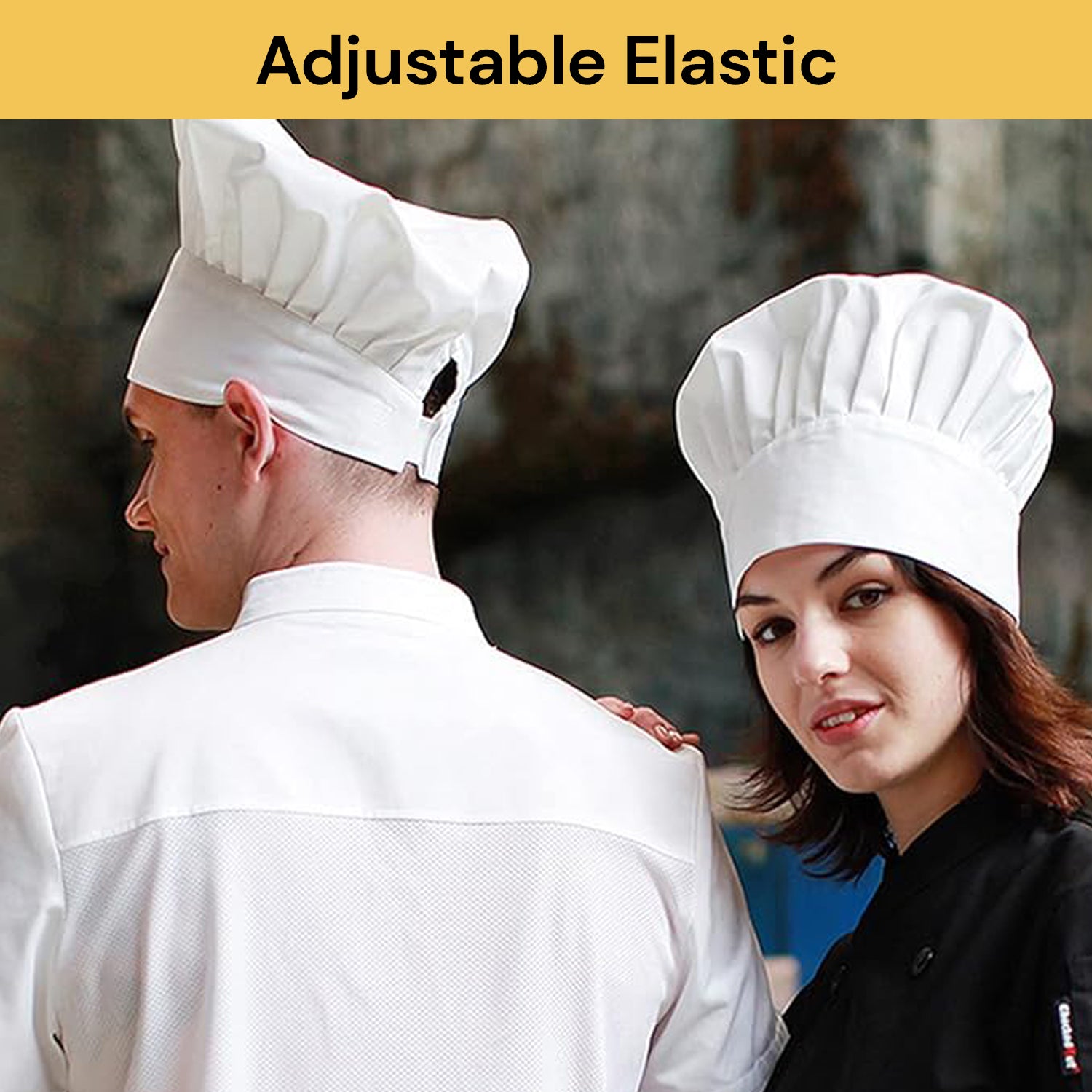 Adjustable Elastic: Standing proudly at 25cm/9.8inch tall, this chef hat offers comprehensive head coverage. An adaptable fastening strip located at the back provides a secure fit, adapting comfortably to all adult sizes.