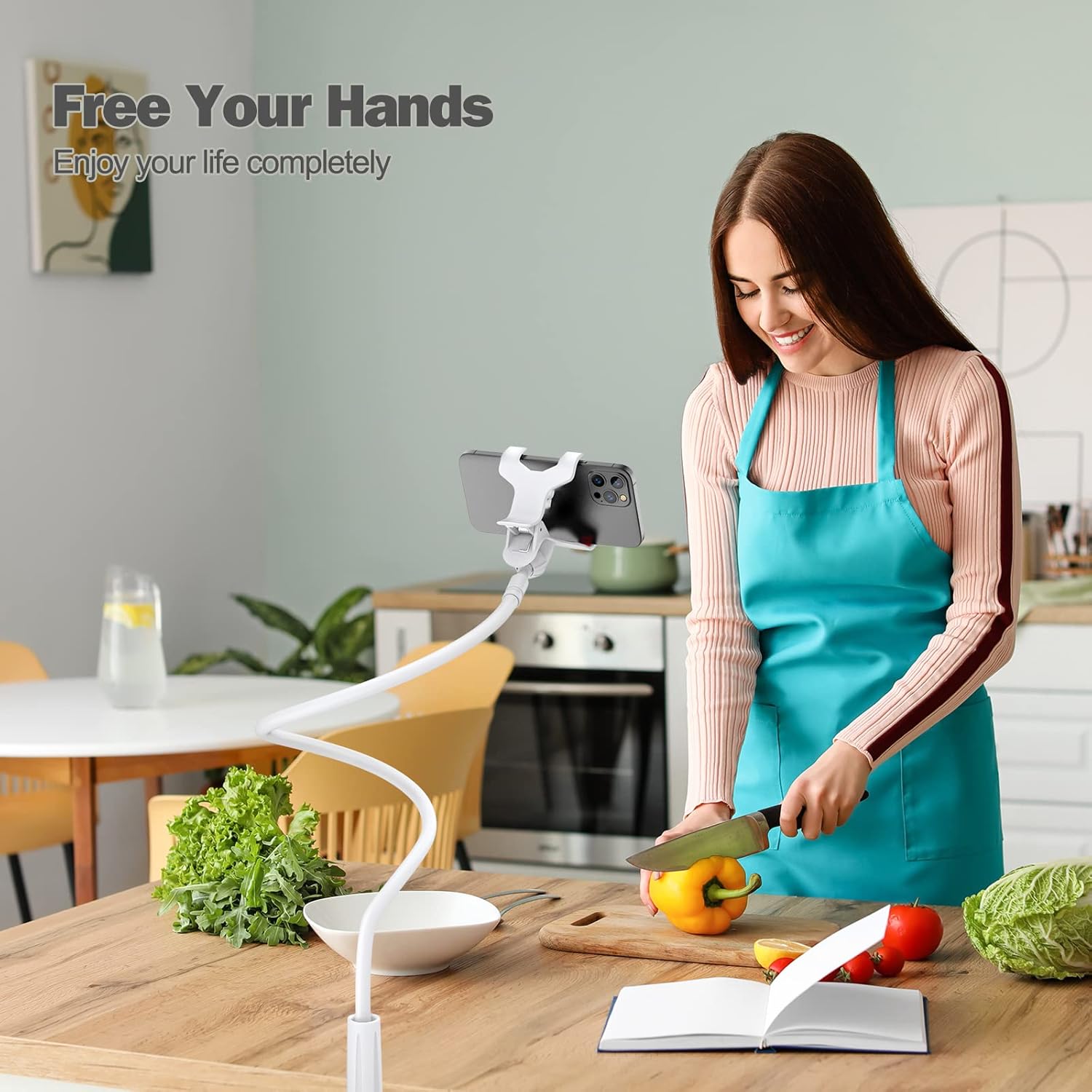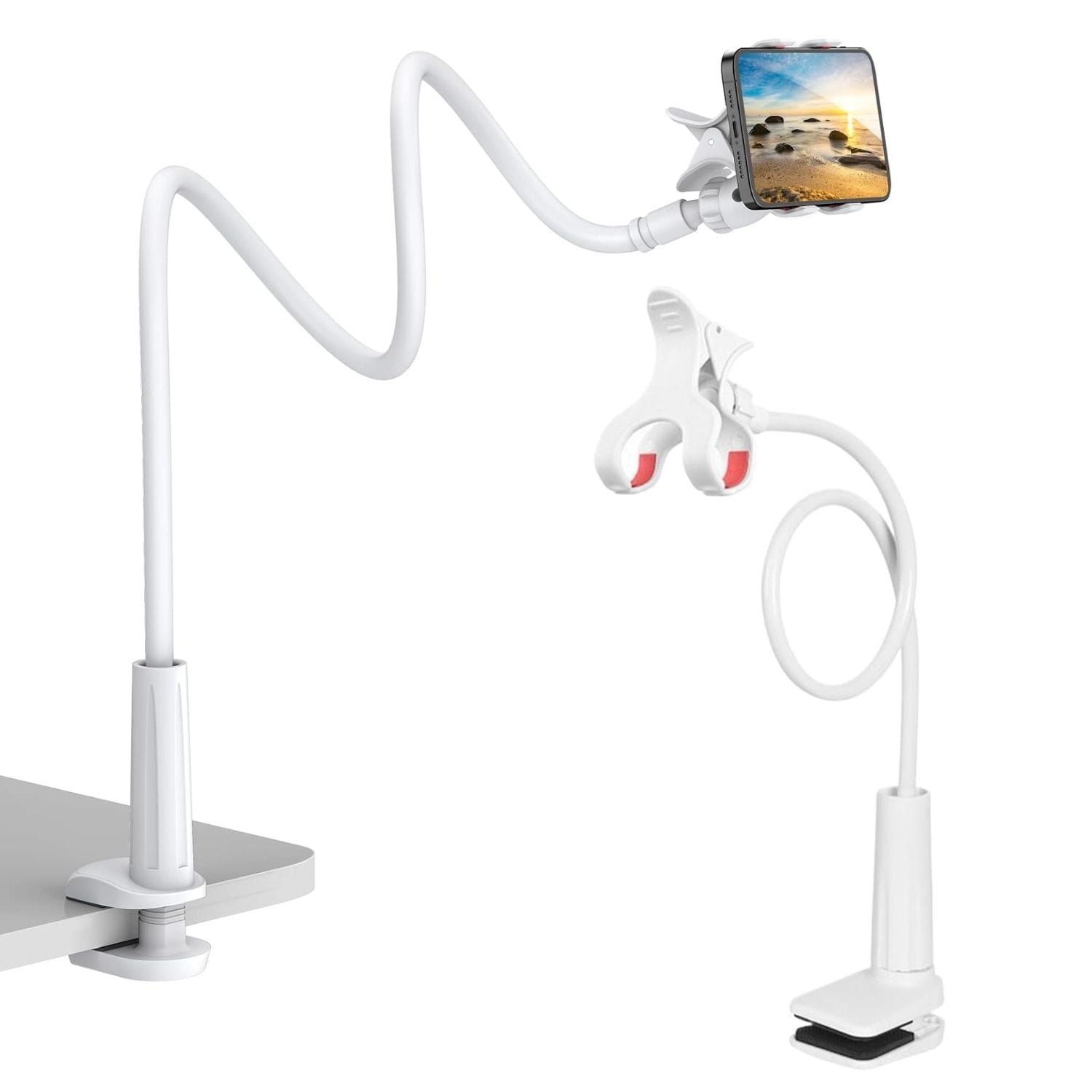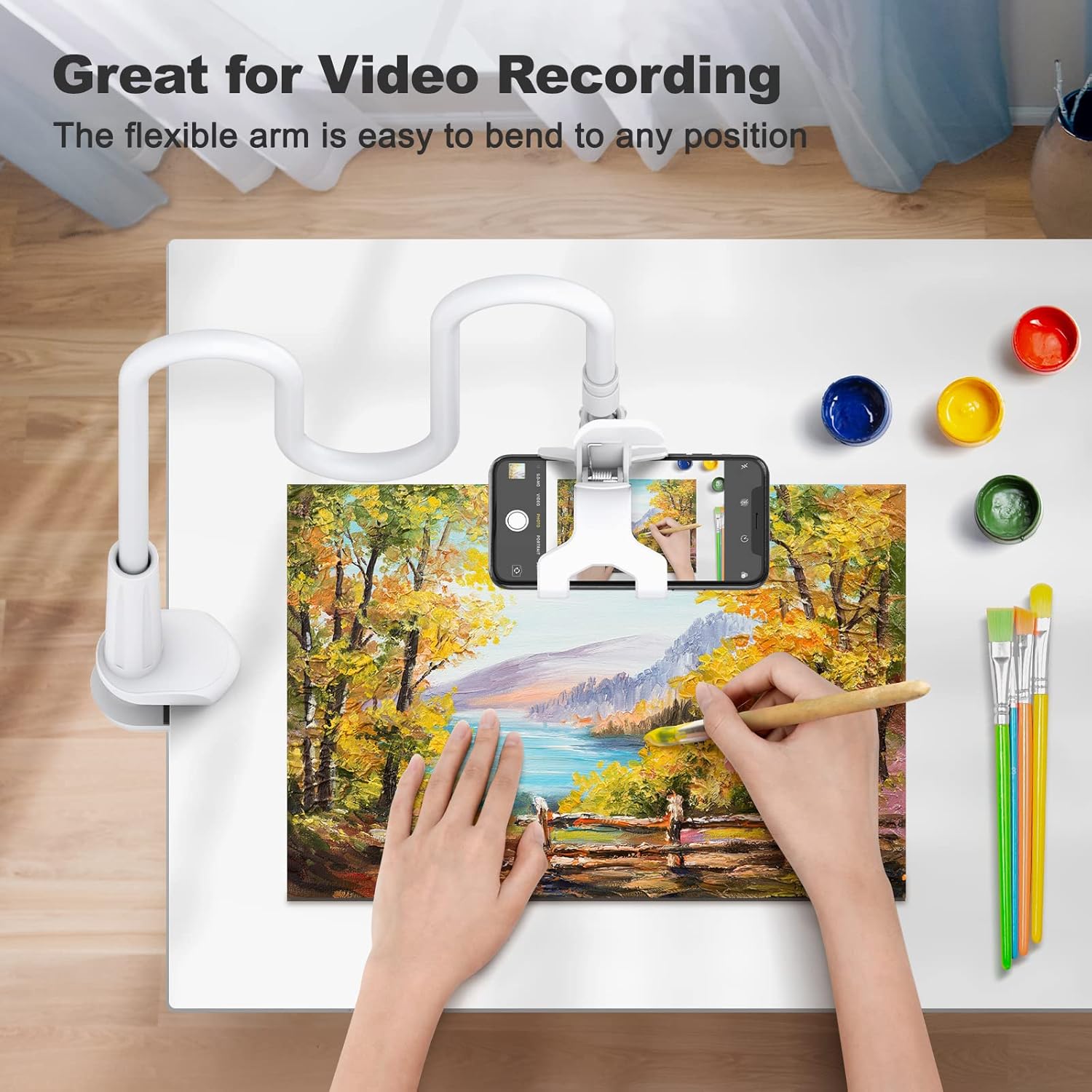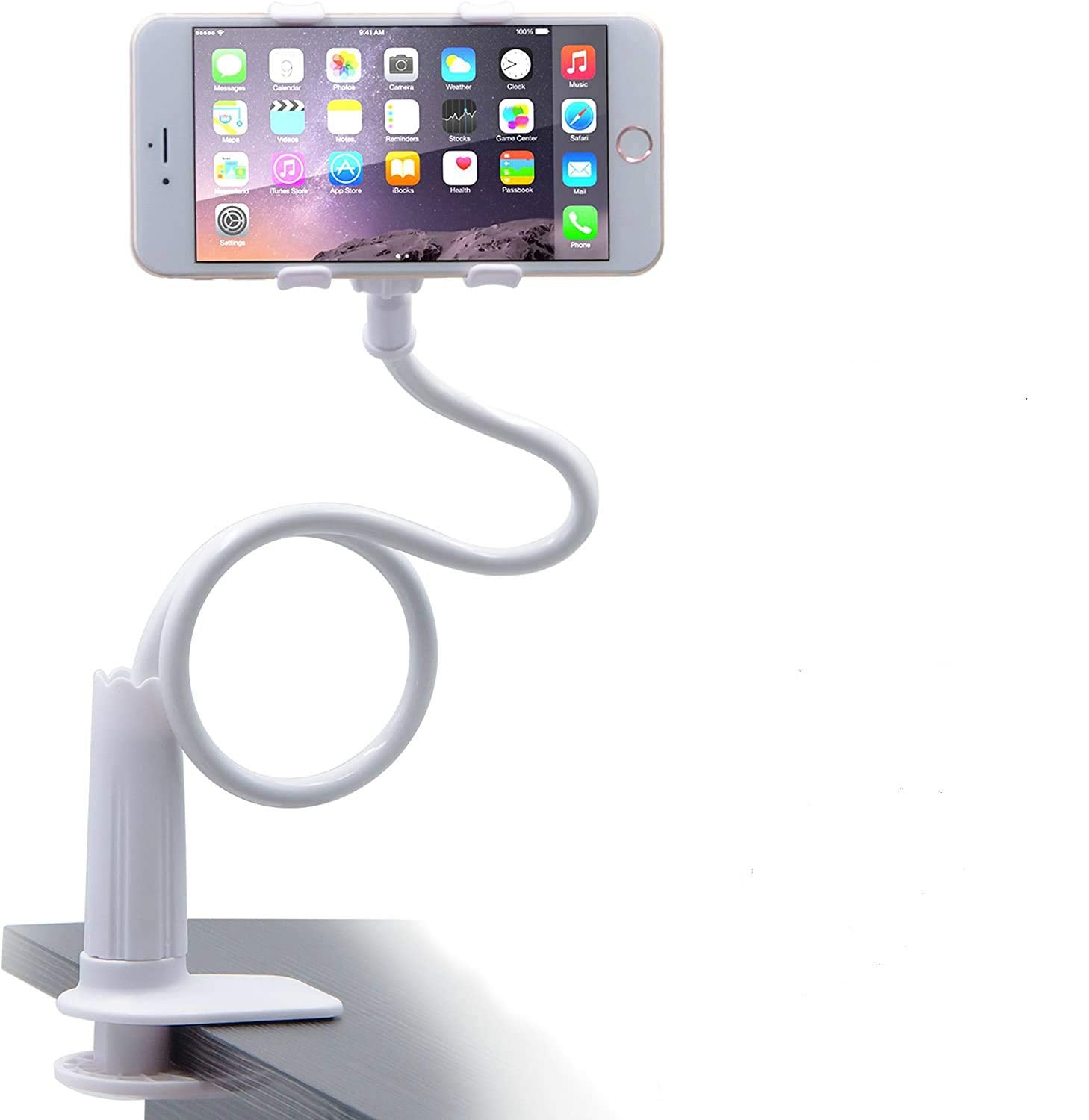 Flexible And Steady Arm: The arm of the Cell Phone Stand adopts better materials and design. It has improvements in both stability and durability. With a long arm 27.5 in (70cm) The depth of the arm can reach 0.6in (1.55cm), not only enough to hold his phone firmly but also flexible enough to bend in any direction. strong and bendy arms secure your smartphone to prevent falling or moving around.