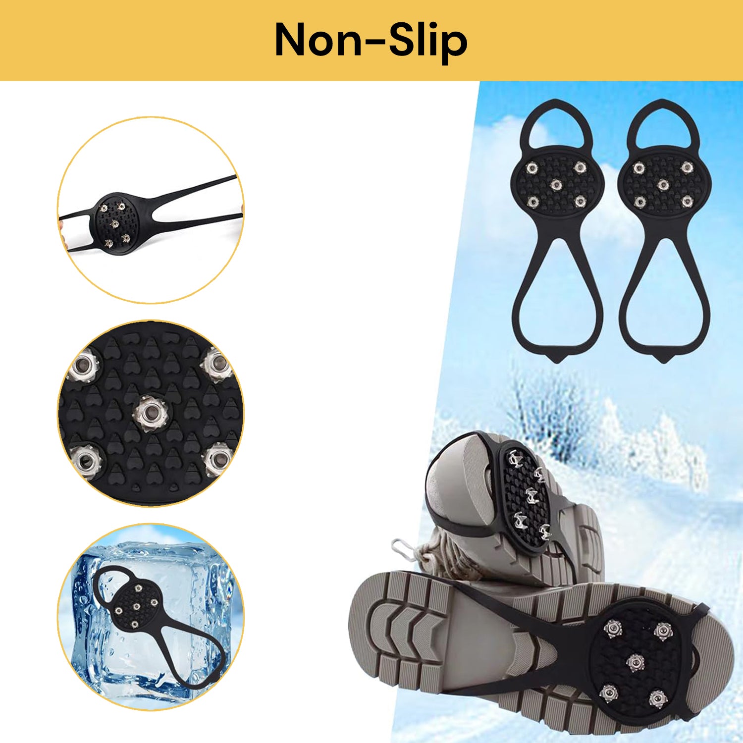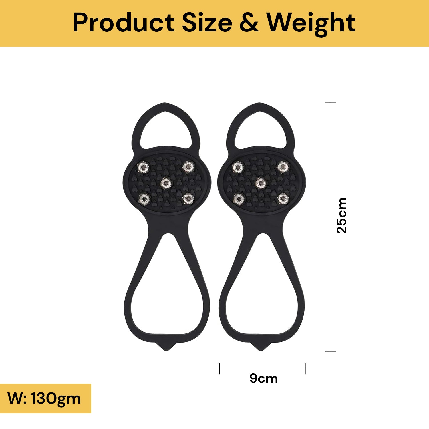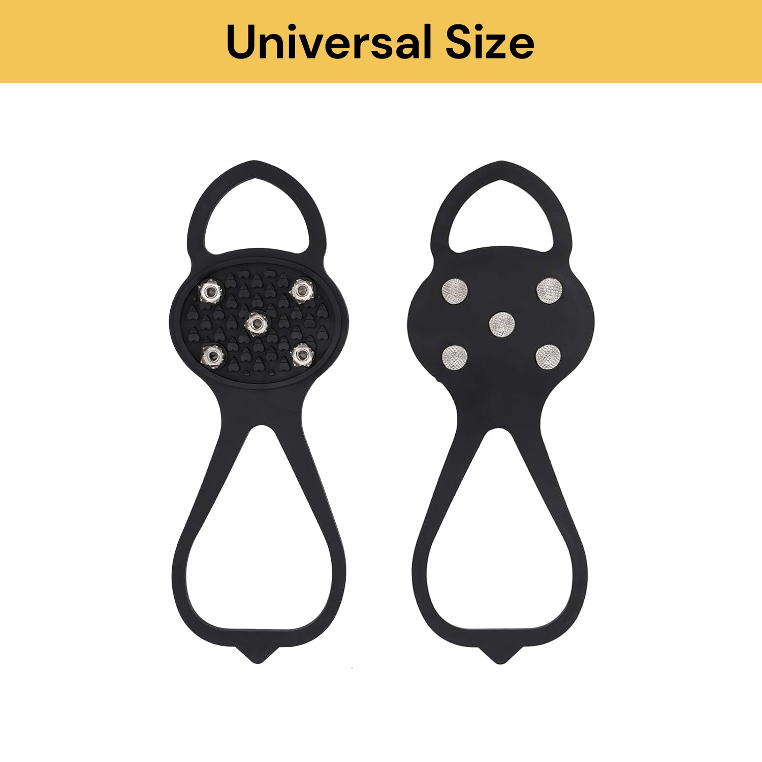 Universal Size: Comes with 1 pairs of shoe ice & snow grips, each pair contains 10 non-slip gripper spikes. Measures about 25*9cm universal size for adult. Provides 360 degrees of traction on cold surfaces for all-direction stability.