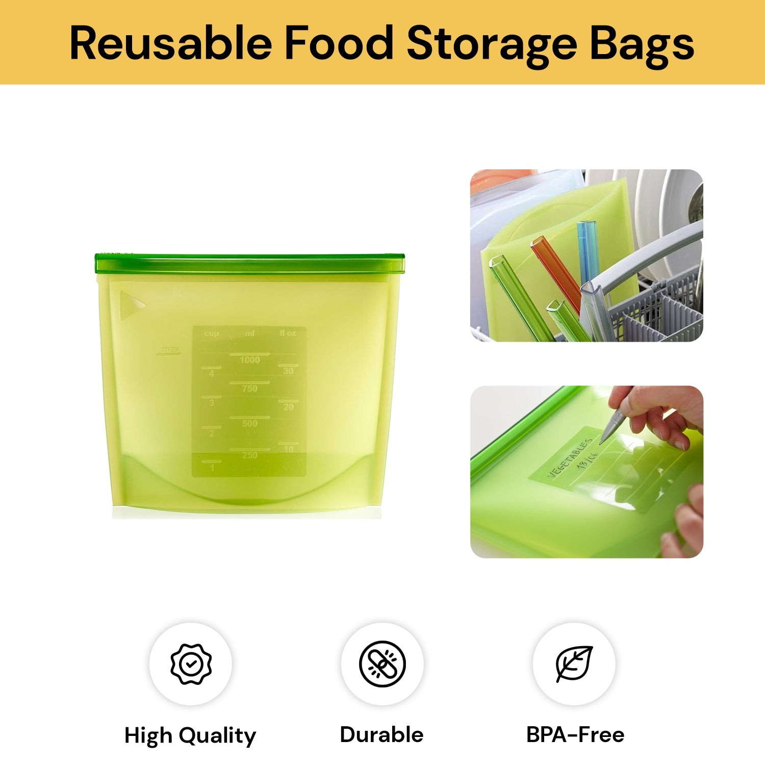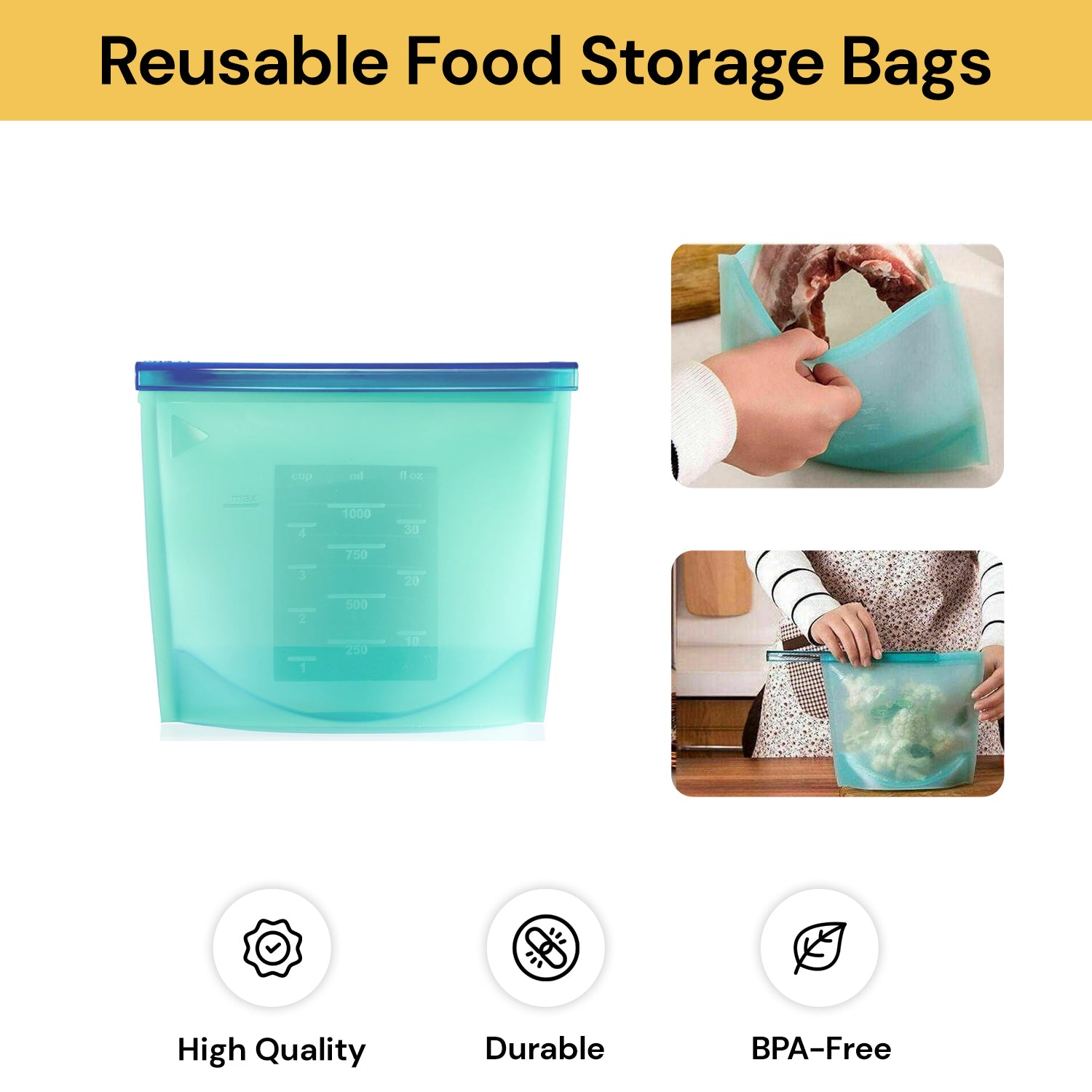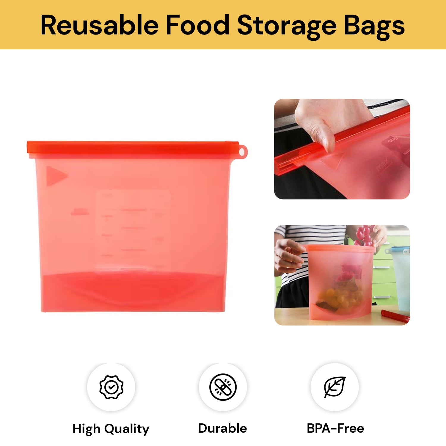 Food Grade Material: Our reusable silicone food storage bags are made from non-toxic and harmless silicone, BPA free and reusable. It is durable and can be used for more than half a year.